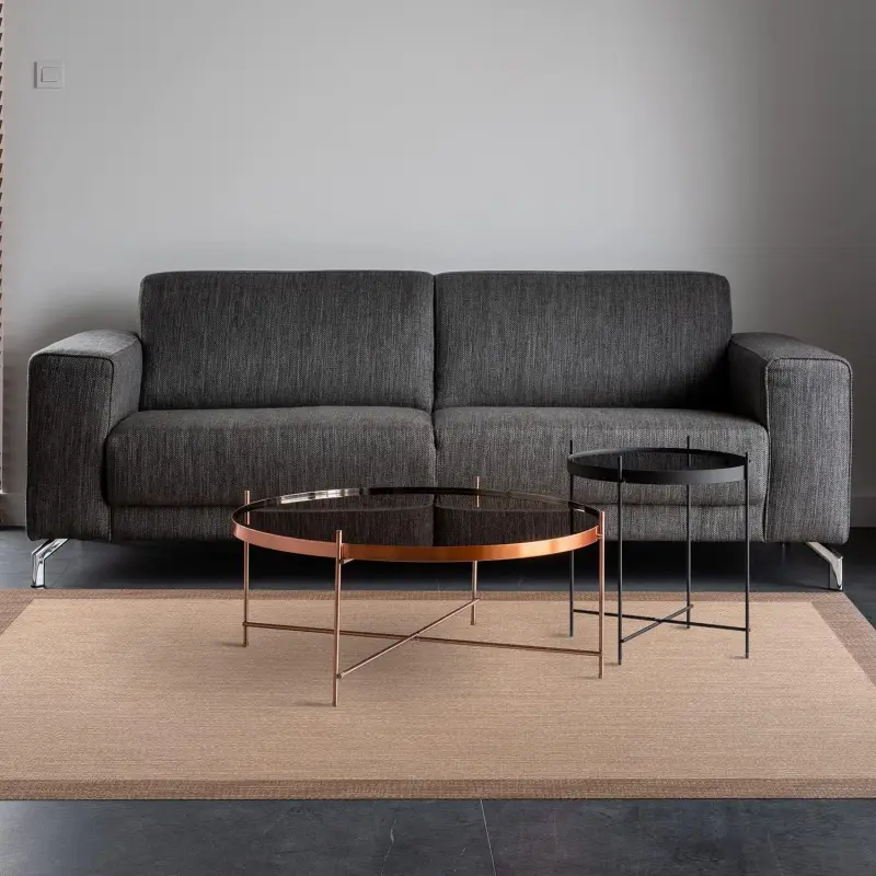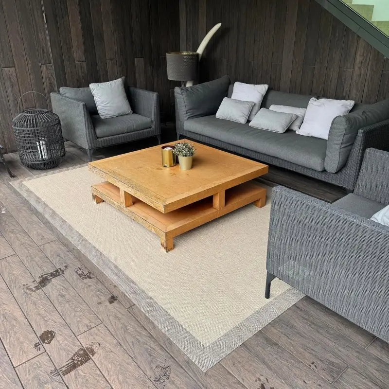 Vinilo trenzado de alta gama con base antideslizante. El vinilo es un material duradero y flexible que combina resistencia y fácil mantenimiento. Su acabado trenzado imita la textura de las fibras naturales, pero con la ventaja de ser más higiénico, lavable y antideslizante.