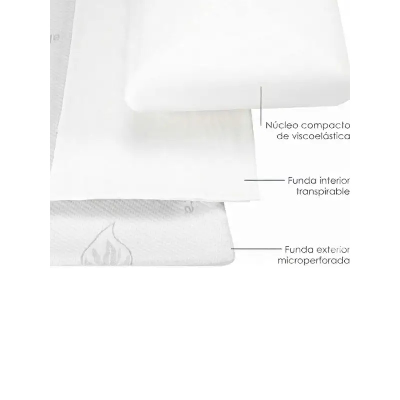 • Núcleo compacto 100% viscoelástico (no copos), con funda exterior de tejido strech, tratamiento de Aloe Vera con hilo plata.
