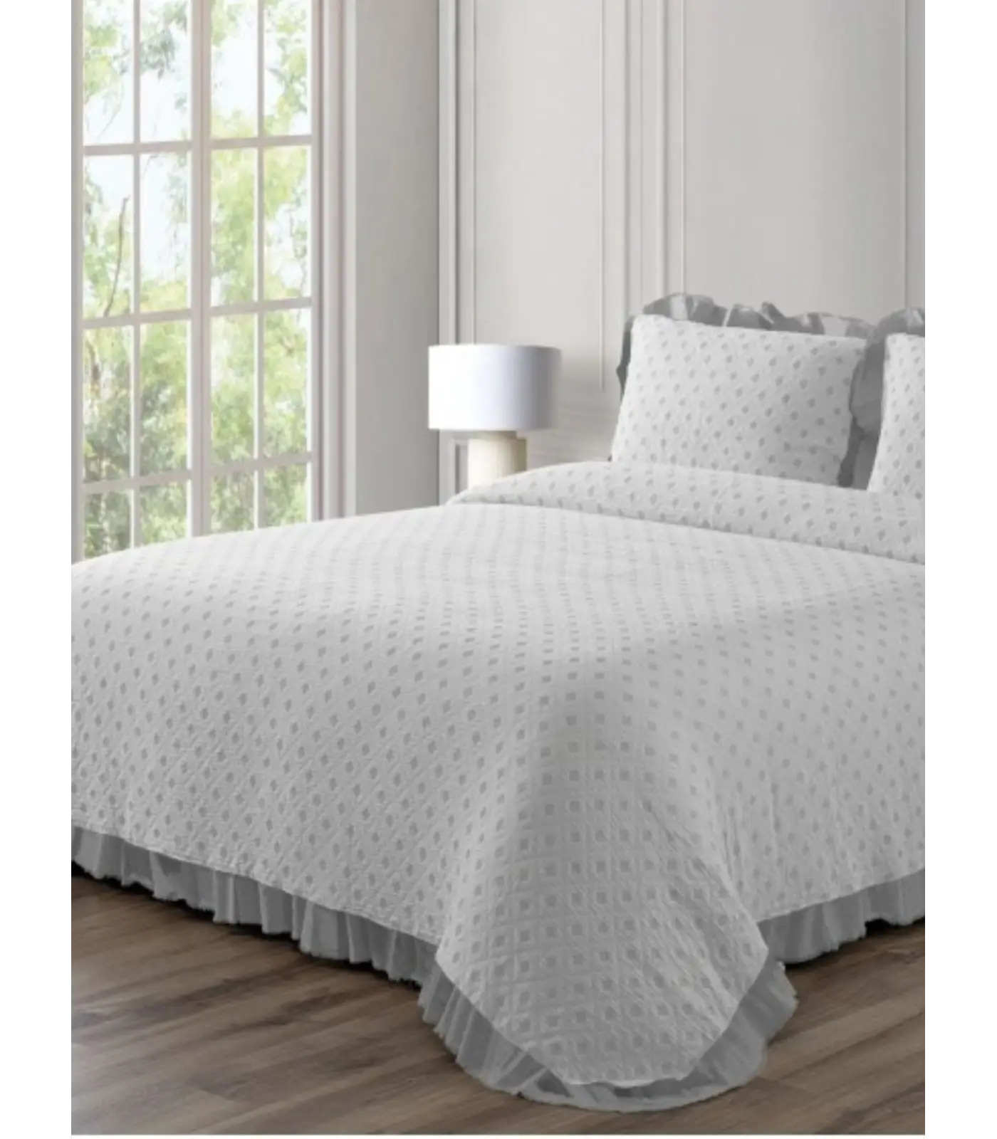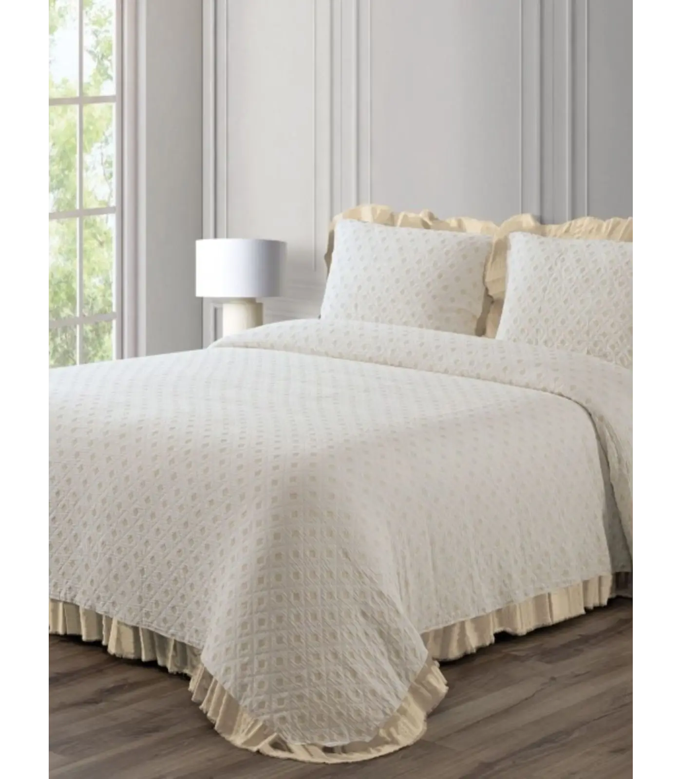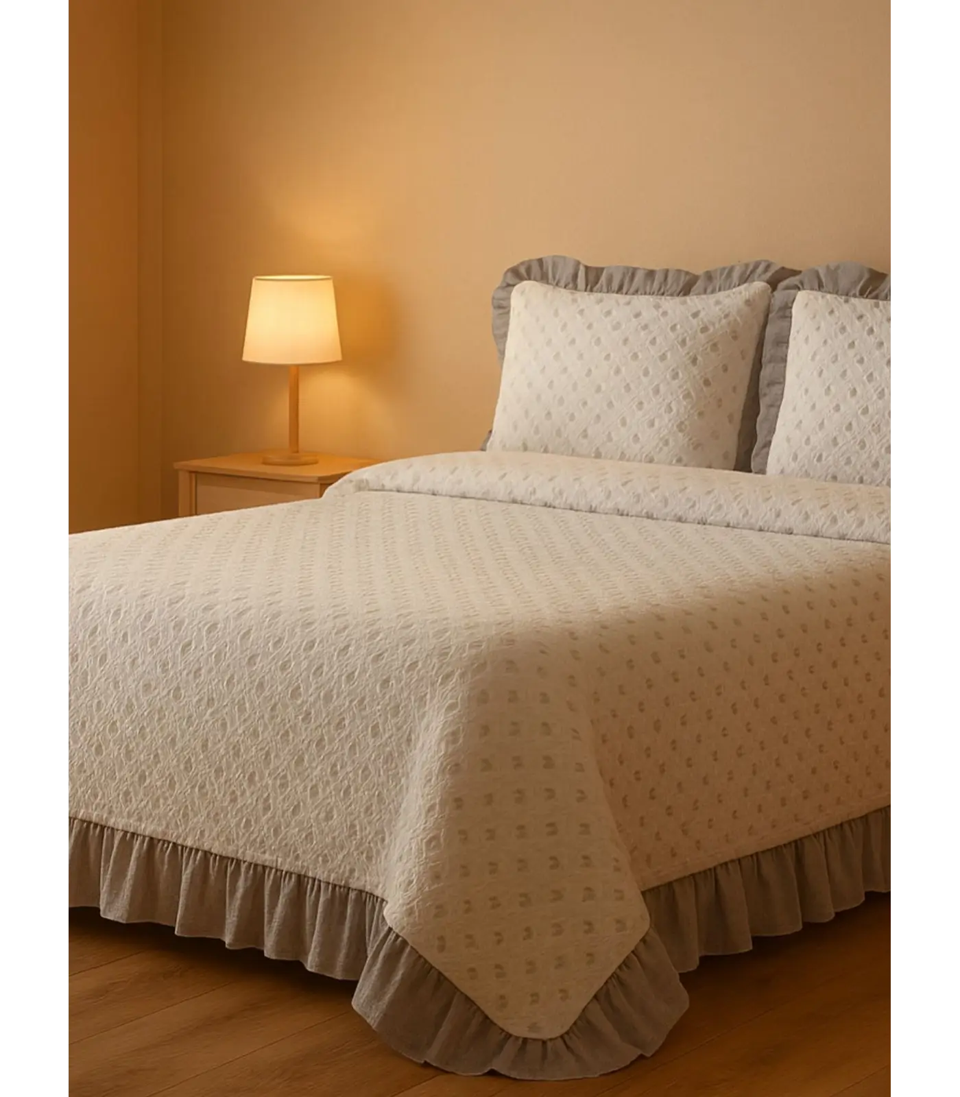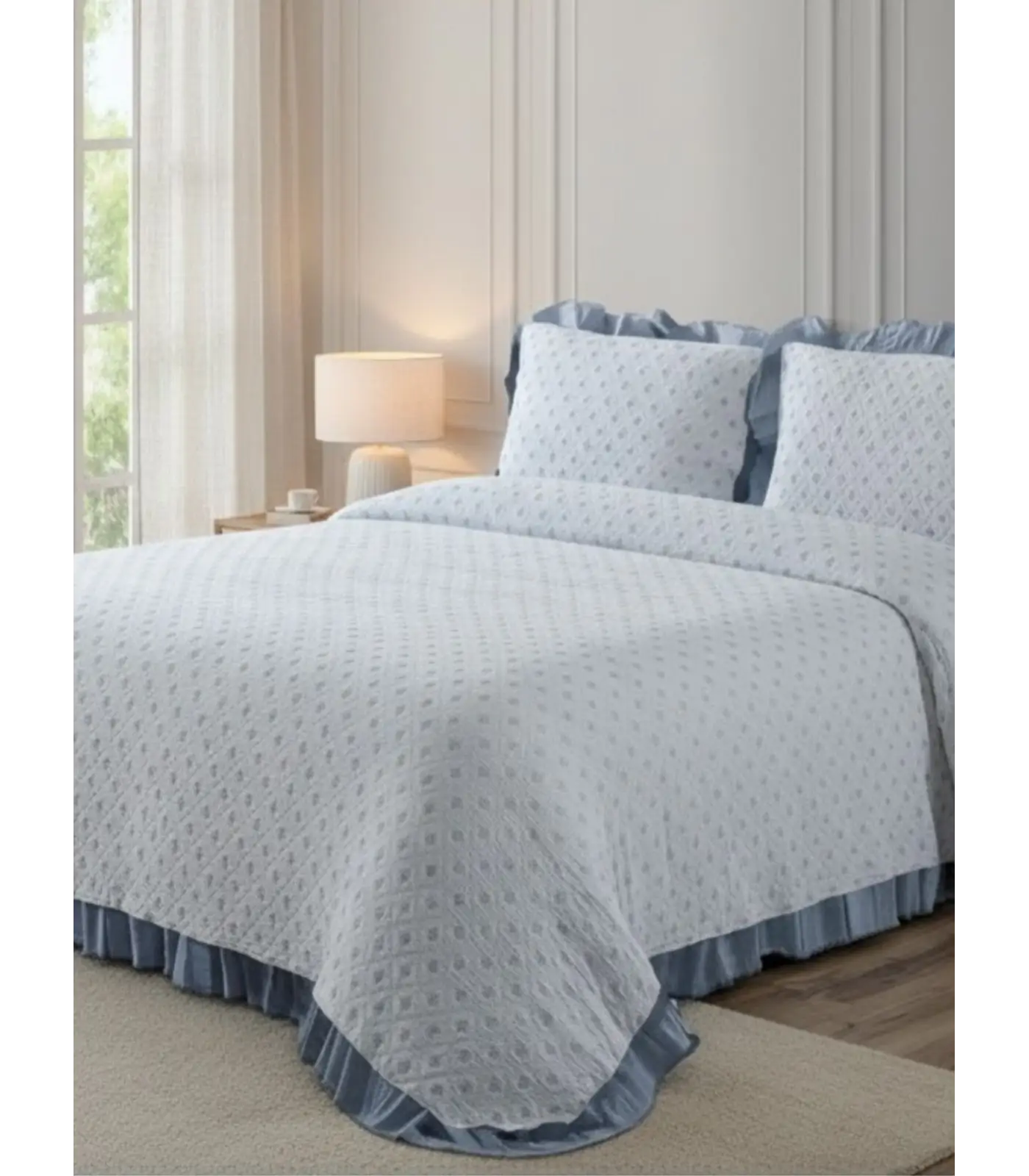 Para esta colcha con volante y en algodón, el cuidado debe centrarse en proteger el acabado decorativo y la suavidad natural: