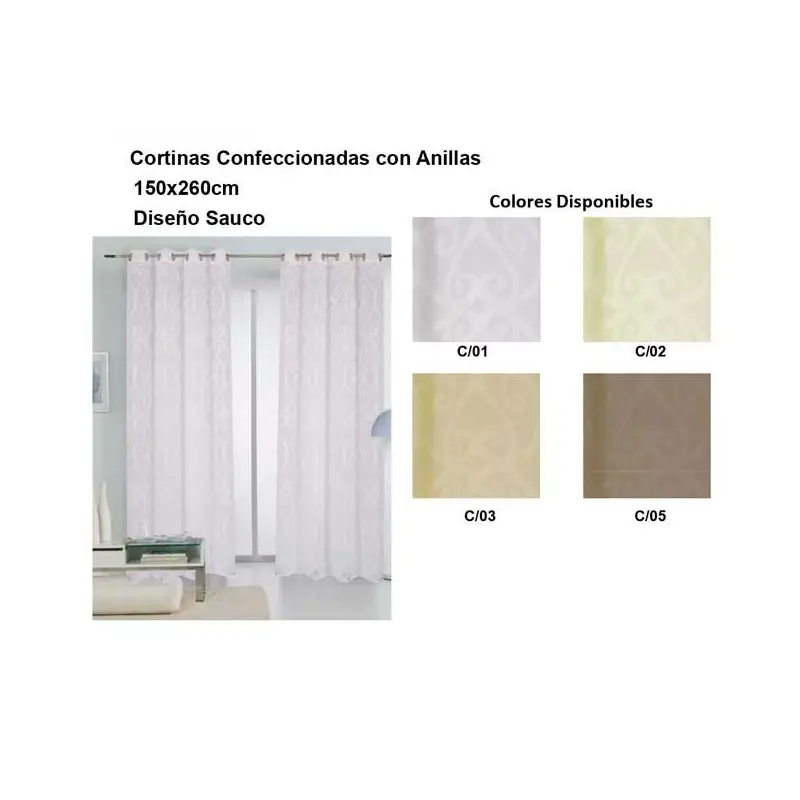 Cortina confeccionada con ollaos en un tejido de transparencia media fácilmente lavable y que no necesita plancha. Medida 150x260 cm. 100% microfibra. Modelo: SAUCO