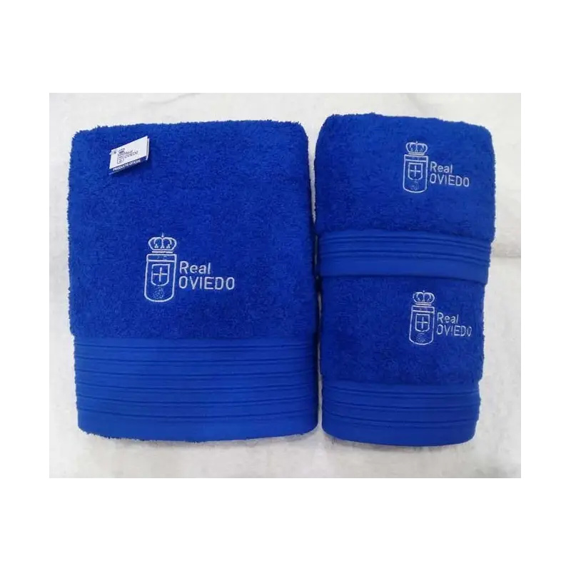 Juego de 3 toallas del Real Oviedo. Incluye una toalla de tocador de 30x50, una toalla de lavabo de 50x100, y una toalla de ducha de 70x140. 100% algodón. Modelo: JUEGO-3P